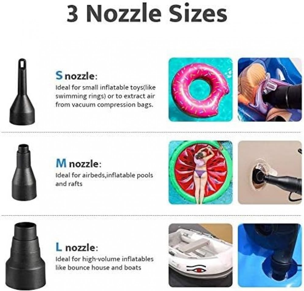 • تحتوي على ثلاث فوهات مختلفة الأحجام، ما يجعلها مناسبة لنفخ العديد من العناصر المتنوعة بسهولة.
